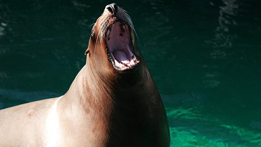 כלב ים נמרי מדגים את שיטת היניקה והסינון עם הופעת אורח של אריה ים קליפורני: