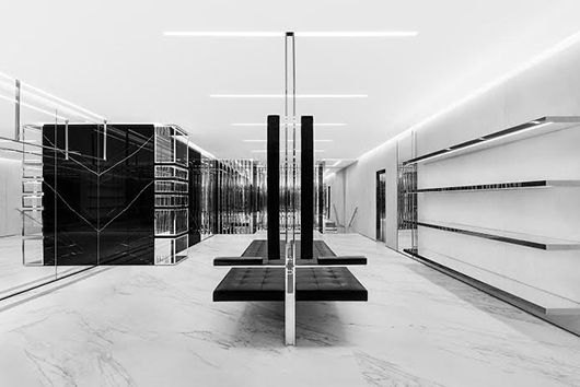 כשהדי סלימאן נכנס לפני כמעט שנתיים לתפקיד המנהל הקריאטיבי של בית איב סאן לורן, הצעד הראשון שלו היה להשמיט את שם המייסד מכותרת המותג ולהעביר אותו מהפך תדמיתי כללי. זה התבטא מיד באתר, בקמפיינים וכמובן בקולקציות שהציג, שזכו לביקורות שליליות בשל דמיונן הרב לבגדי רשתות חסרי מעוף. עתה הוא משלים את המהפך גם בחנויות המותג, שאחת המרכזיות שבהן, ברחוב סלואן שבמחוז צ'לסי היוקרתי של לונדון, נפתחה לאחרונה מחדש למבקרים. את החנות תכנן סלימאן בעצמו בסגנון תנועת המודרניזם הצרפתית, וזה מתבטא בקווים חדים וברהיטים כדוגמת משטחי הישיבה עשויי העור וכן באנרגיות הרוקנ'רוליות שהוא שואף להכניס לבגדיו ולעולם האופף את המותג. סלימאן הוא מניפולטור מסחרי מהולל, והוא משלב בחלל טריקים קמעונאיים מעניינים כמו ארונות זכוכית עם פריטים כז'קט אופנוענים מכוסה פאייטים שמחירו מסתכם בחמש ספרות עם סימן הליש"ט לצדן, משל היו מוצגים מוזיאליים. תכסיס נוסף, במישור היחצני יותר והאכזרי ללא ספק, היה פיטור צוות החנות הוותיק לטובת נערים ונערות שגויסו על ידי המעצב בבתי הקפה של מזרח העיר, והדרישה היחידה להעסקתם בבוטיק המוכר כמה מהבגדים היקרים ביותר של רחוב הקניות האקסקלוסיבי הוא מראה ברוח החזון האסתטי של המעצב – צעיר, גרום וחלול – שילוב של ההיפסטר האנגלי המצוי עם כוכב אינדי סטייל פיט דוהרטי של תחילת שנות האלפיים.