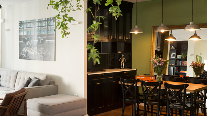 סיור הצצה בדירת שני חדרים וחצי ברחוב פרוג, שתוכננה על ידי האדריכל רענן שטרן. משהו בשילוב בין הקיר הירקרק בפינת האוכל, ידיות הפליז של ארונות המטבח, הסירים התלויים ברישול הנונשלנטי ופרטי הנגרות הכהים בסגנון אירופי קלאסי הזכיר כנראה דירות מקבילות בפריז – ואנחנו לגמרי קונים את זה. ממש כמו בפריז, גם כאן מדובר בבעלי בית שאוהבים לבשל, לאכול ולארח בנוחות, ללא כל גינוני רשמיות מיותרים: המטבח, פינת האוכל והסלון חולקים חלל משותף כמעט לגמרי, ומופרדים זה מזה רק ברמיזות באמצעות ריהוט, פרזול וצבע.