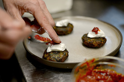 מי שנתנה לו את ההשראה לסגירת המנה הייתה שוטפת הכלים במסעדה. "עובדים רבים בנהריה הם יוצאי משפחות צד"ל שגרים פה", הוא מספר. "עבדה פה שוטפת כלים שנתנה לי לטעום את ה'קיבה' הלבנונית. היא טחנה את הבשר עם הבורגול ואז טיגנה את המנה. אמרתי: אמיר את החומוס של הפלאפל בבורגול. השמטתי את הבשר, הוספתי תרד ערבי ותבלינים ויצרתי לביבות פריכות. עליהן שמתי את טרטר הדג, שהתחבר לי מבחינת השפה. את הקרם פרש של הבליני החלפתי בלבאנה והוספתי נגיעת אריסה לפאנץ'". התוצאה: מנה טעימה להפליא, שכולה משחק בין מרקמים וטעמים.